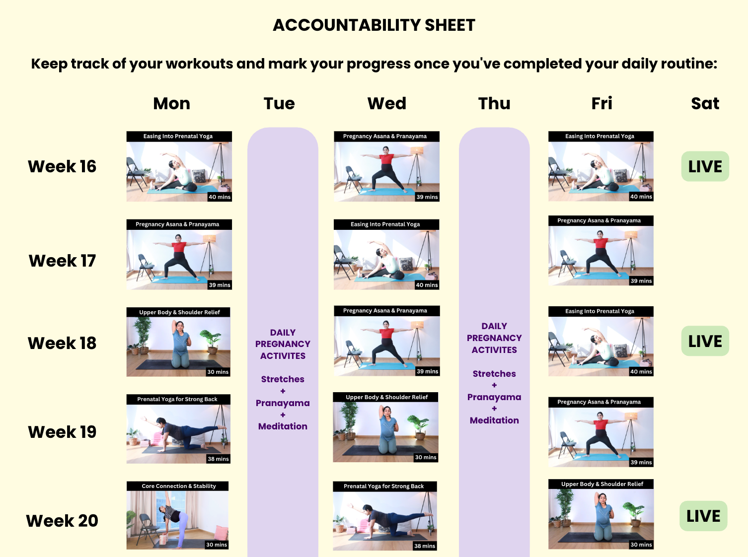 | Trimester 2 | Strength + Stability + Energy | Weeks 16 to 27 | 4 (recorded) |